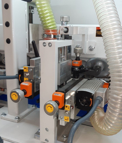 ![]() | Чистовая фрезеровка свесов Предназначен для фрезерования верхнего и нижнего свесов кромочного материала. Применяется для любых типов кромки толщиной 0,4 - 3 мм. Оснащён фрезами с радиусными ножами для идеального фрезерования. Мощность двигателя 2 х 0,55 кВт., частота вращения 12 000 об/мин. Имеет удобную тонкую настройку с помощью счетчиков с цифровой индикацией. Винт с мелким шагом резьбы. Точность настройки 0,01 мм. С помощью больших вертикальных и горизонтальных круглых копиров обеспечивается точное отслеживание профиля детали и гарантирует плавный заход на деталь без подрывов. |