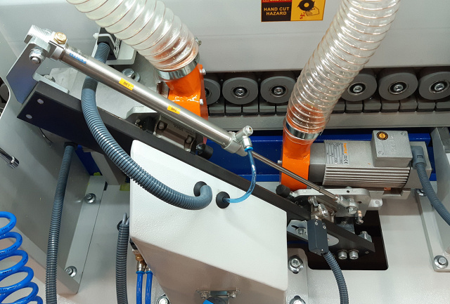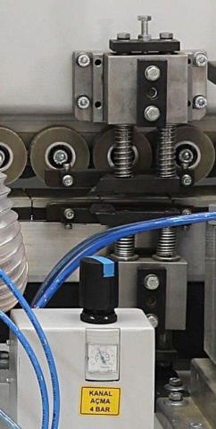 ![]() | Пресс группа Тяжелая зона прижима оснащена главным прижимным роликом диаметра Ø120 и тремя допрессовочными роликами. Длинная зона прижима гарантирует окончательную кристаллизацию клея перед механической обработкой для исключения сдвига кромки и минимизирует клеевой шов, делая его идеальным. С помощью цифрового счетчика регулируется прижим на разную толщину кромочного материала. Усилие пресс группы задается механически, что позволяет качественно приклеить кромочный материал к детали. Значение прижима кромки от толщины отображается на цифровом счетчике. |