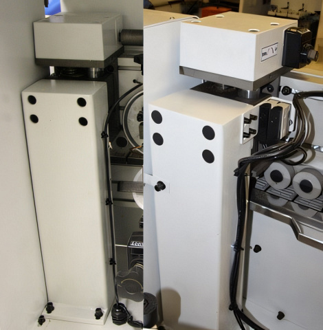 ![]() | Узел предварительного фрезерования Предназначен для устранения дефектов раскроя (микросколов, ступеньки от подрезной пилы), гарантирует перпендикулярную и прямолинейную геометрию поверхности торца детали. Две фрезы с алмазными напайками: Ø 100 x 30 H43 L/R. Автоматический обдув торца заготовки от стружки. Два двигателя противоположного вращение с автоматическим подводом/отводом в зону обработки убавляются с помощью пневмоцилиндров: Регулировка по высоте, позволяет максимально использовать весь ресурс инструмента. Полностью закрыт пылезащитным кожухом. |
