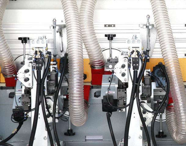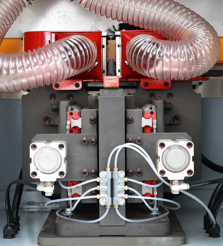 ![]() | Узел радиусной циклевки Точность позиционирования заготовки за счет копиров большого диаметра Ø 180 мм по плоскости с верху и с низу и конусных копиров Ø 120 мм по торцу заготовки.Система охлаждения ножей сжатым воздухомУзел оснащен аспирационными патрубками.QuickSet, пневмоперенастройка узла на 2 толщины кромки (оговаривается при заказе станка) |