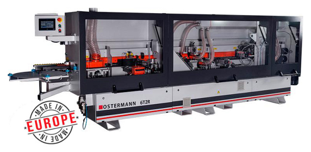 Автоматический кромкооблицовочный станок OSTERMANN 6T2R предназначен для облицовывания прямолинейных кромок плитных материалов рулонными кромками АБС, ПВХ и полосовым кромочным материалом толщиной до 3 мм.