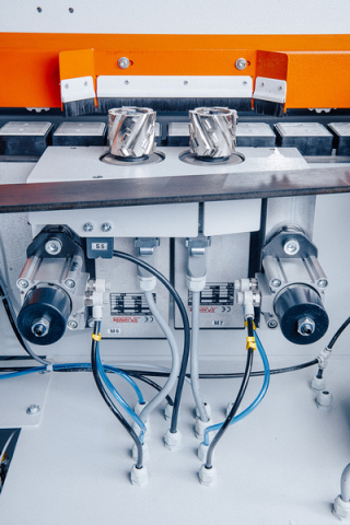 ![]() | Клеевой узел Быстросменный клеевой с бачок с тефлоновым покрытием объемом2 л. для клея EVA имеетнижнее расположениеотносительно клеенаносящего вала. Время смены бачка 2 мин позволяетиспользовать клей разного цвета;Отсутствие нагара обеспечиваетвысокое качество наклейки кромки;Винтовая точная настройка количества клея гарантируетаккуратный клеевой шов;Время нагрева клея 15 минсокращает до минимума время от включения станка до начала работы;Электронный контроль температуры в клеевом бачке и на клеенаносящем роликеобеспечивает идеальные условия нанесения клея;Автоматическое понижение температуры клея на 50 °C при перерывах в работе более 15 мин позволяетсохранить качества клея;Опорный копир перед клеенаносящим валомпредохраняет заготовки от удара и повреждения торца о вал. |