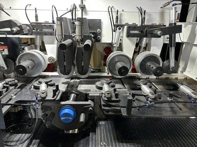 Станок оснащен регуляторами, с помощью которых управляются все прижимы (ролики, плиты, боковые прижимы). Это обеспечивает безупречное позиционирование заготовки в процессе обработки в каждой зоне. Настройка усилия прижима каждой группы прижимов роликов производится быстро и удобно с центрального пульта управления, при этом нет необходимости открывать защитное ограждение.