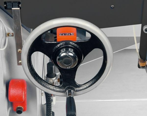 ![]() ![]() | НАСТРОЙКА ТОЛЩИНЫ СЪЕМА НИЖНИМ ФУГОВАЛЬНЫМ ВАЛОМТолщина съема нижнего фуговального вала регулируется за счёт маховика по измерительной шкале. Для дополнительного контроля маховик оснащен механическим счетчиком. |