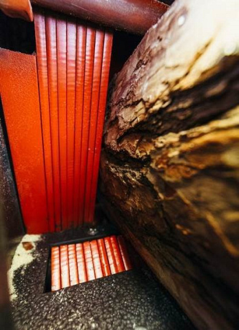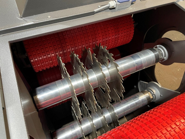 Контропоры и пильные узлы закрыты открывающимся шумопоглощающим кожухом, при открытии которого открывается удобный доступ к пильным валам для смены постава пил.