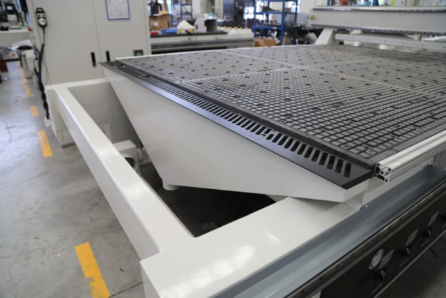 Данная автоматическая производственная линия предназначена для скоростного высококачественного смешанного раскроя полноформатных плитных материалов (ДСП, МДФ) посредством фрезерования с последующей присадкой технологических отверстий по технологии NESTING.