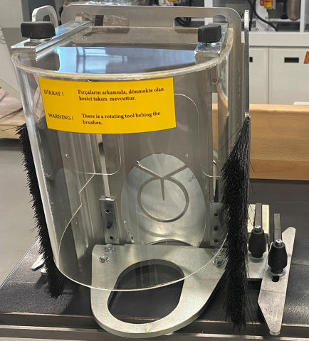 ![]() | Дополнительный защитный кожух При установке вала ф40мм с увеличенной высотой, сверху на кожух устанавливается дополнительный защитный кожух для фрез Ø до 210 мм. |