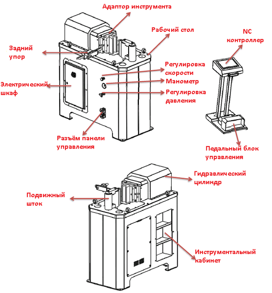 Станок представляет собой цельную стальную конструкцию с размещенным горизонтально гидравлическим цилиндром, который передвигает шток с инструментом в зоне рабочего стола. Функциональная поверхность стола позволяет устанавливать самые различные инструменты и приспособления, делая пресс универсальным и подходящим под многие задачи: