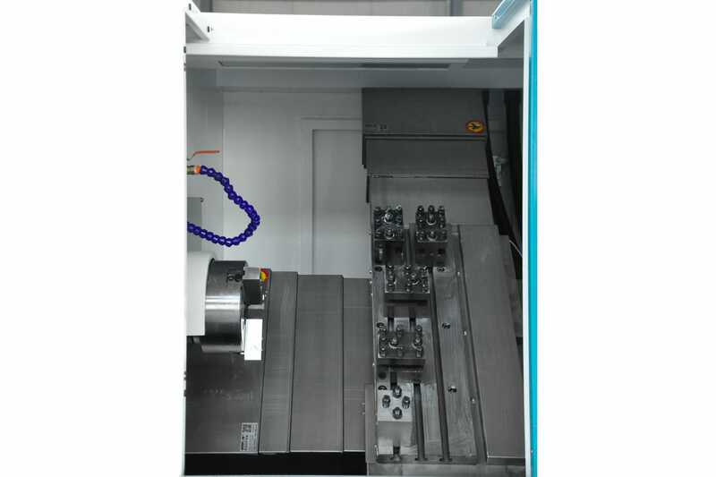 - Такая компоновка даёт максимальное преимущество для быстрой обработки неболь-ших деталей, так как экономится немало времени на смене инструмента. Не нужно ждать по-ворота револьверной головы, направляющие качения дают увеличение скорости перемеще-ний в 2-3 раза, по сравнению с направляющими скольжения. Лёгкий доступ к зоне резания, стружечный конвейер с тележкой для стружки, гидравлический зажим кулачков патрона.