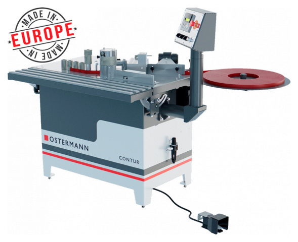 Кромкооблицовочный станок OSTERMANN CONTUR, предназначен для облицовывания прямолинейных и криволинейных кромок плитных материалов рулонными кромками АБС, ПВХ и полосовым кромочным материалом толщиной до 3 мм. Приклеивание ведется при ручной подаче заготовки.