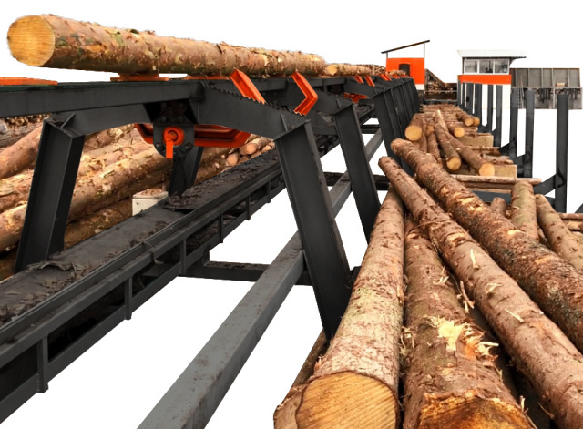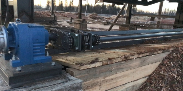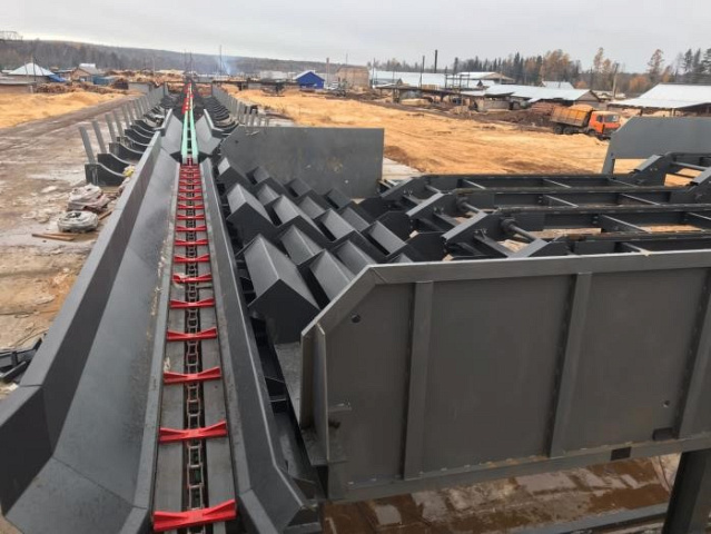 Цепной транспортер оснащен разноширокими траверсами для эффективного перемещения бревен разных диаметров и кривизны.