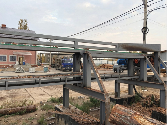 Состоит из горизонтального участка длиной 10 м (5 м грузовой стол + 5 м раскатной стол) и шагового подающего транспортера типа СТЕПФДЕР. Разовый объем загрузки до 40 м3бревен.