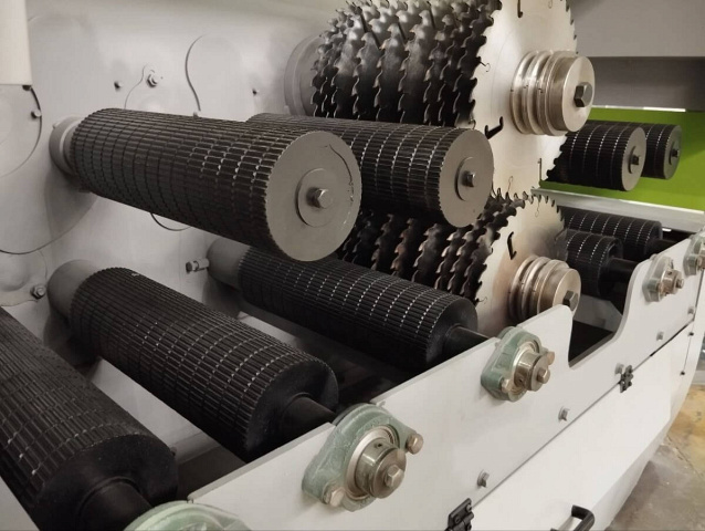 В многопильных станках мод. EcoWood MS- 220 предусмотрена вальцовая система подачи. Она состоит из 5-ти нижних приводных рифленых вальцов и 4-х верхних приводных прижимных вальцов. Данная система подачи наиболее оптимальна при обработке лафетов толщиной до 220 мм соответственно.