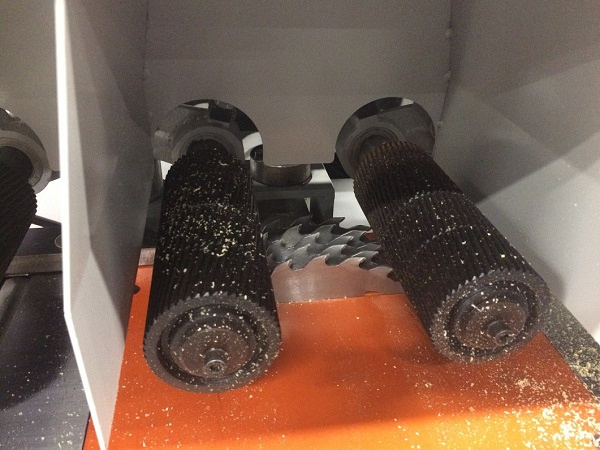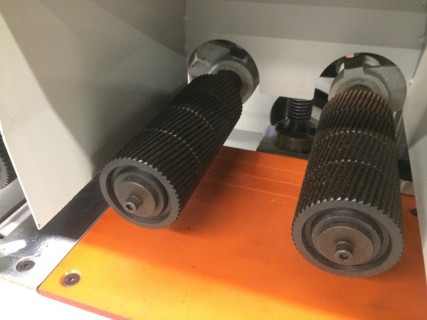Верхние приводные вальцы металлические. Косые насечки обеспечивают надежную подачу заготовки и ее прижим к направляющей линейке. В столе расположены гладкие стальные ролики для уменьшения силы трения.