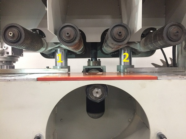 Подающие вальцы имеют пневматический прижим. Каждый от отдельного пневмоцилиндра. В отличие от пружин пневматика надежнее фиксирует заготовку и удобнее в настройке.