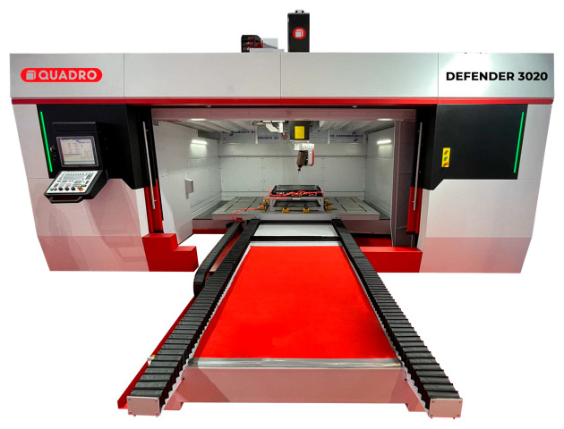 Подвижный портал и неподвижный стол стальной конструкции с ребрами жесткости. Продольное перемещение (ось X) производится с помощью оптимизированного по вес QUADRO DEFENDER 3020у и твёрдости портала. Для высоких динамических характеристик и точности поперечное перемещение (ось Y) производится кареткой, которая проходит по порталу, на котором установлена (ось Z) с высокой прочностью при изгибе на большие диапазоны. Все движения линейных осей управляются электрическими «бесщёточными» двигателями на стойке и оснащены высокоточными, предварительно натянутыми редукторами.