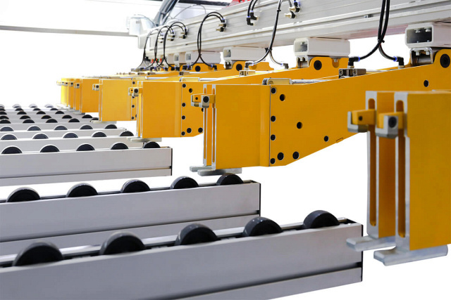 Мощный толкатель предназначен для точного и быстрого позиционирования плит ДСтП. Толкатель оснащен восемью захватами (зажимами).Для деликатной ,но в то же время надежной фиксации плит, зажимы имеют двухпальцевую конструкцию Они обеспечивают прочный захват пакета ДСтП. Захваты позволяют выталкивать стопу раскроенных плит за линию раскроя, что облегчает их перемещение и выгрузку.