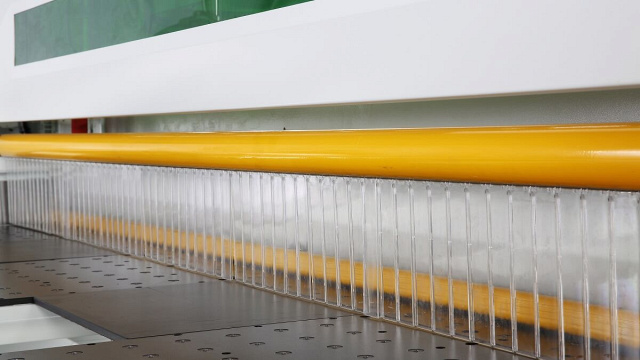 Nanxing NPL-330HG  Прижимная балка (верхний прижим)  Привод верхнего прижима (прижимная балка) осуществляется от двух пневмоцилиндров, что обеспечивает жесткий и равномерный зажим плит ДСтП во время раскроя  Параллельность перемещения прижимной ба...Прижимная балка (верхний прижим)