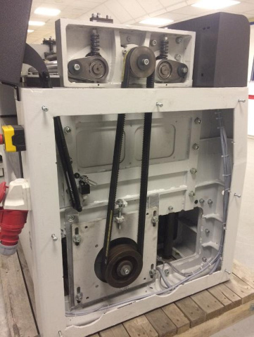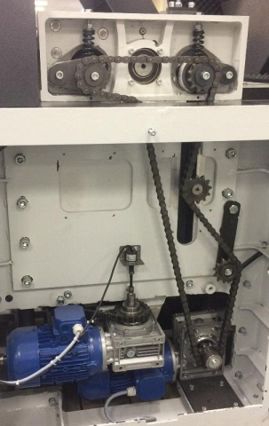 ![]() | Система подачи Привод верхних подающих роликов и приводных роликов в столе осуществляется от отдельного двигателя мощностью 1,5 кВт через редуктор посредством цепи. |