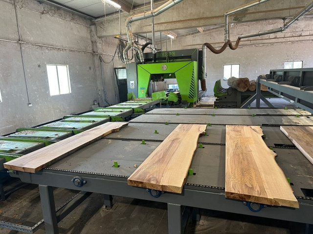 4 комплекта гидравлических зажимов с самостоятельной настройкой под сечение бревна и подъемными роликами для выравнивания конусности бревна. Минимальная толщина последней доски 25 мм.