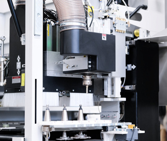 Данное оборудование обладает расширенным функционалом по фрезерной обработке с помощью двух фрезерных агрегатов, а также автоматической сменой инструмента на верхнем фрезерном агрегате и инструментальным магазином на 4 ячейки.