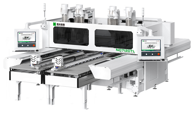 Nanxing ND712DTL  Автоматическая базирующая система  Детали, перемещаясь по приводным конвейерам, перед входом в зону обработки упираются в специальные базирующие планки, которые выравнивают их положение  Далее включаются боковые упорные балки с р...Автоматическая базирующая система