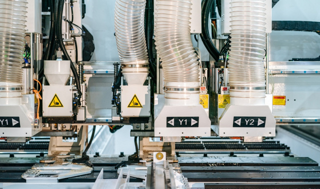 Благодаря синхронизированной системе вертикальных независимых пневматических прижимов, обрабатываемые детали надежно фиксируются в рабочей зоне станка во время цикла сверления. Это гарантирует высокую точность при сверлении в пласть, даже в случаях, если детали имеют изогнутую форму из-за внутренних напряжений в материале. При сверлении деталей в торцы, при выборке пазов, а также при фрезерных обработках, когда во время обработки происходит движении детали – используются пневматические роликовые прижимы, которые также надежно прижимают детали, при этом сохраняя возможность её перемещения.