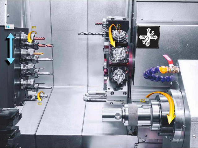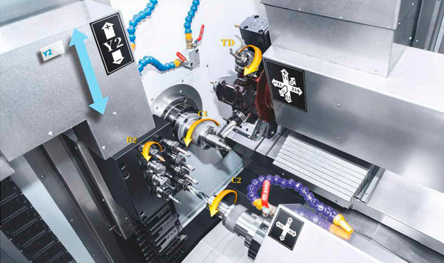 Перемещение по осям Перемещение по оси Y1 составляет 100 мм (±50 мм), а угол между осями Y1 и X1 составляет ровно 90°, поэтому центр тяжести револьверной головки всегда находится на опорных направляющих, обеспечивая максимальную жёсткость в процессе обработки. Ход по оси Y2 - 570 мм, а быстрое перемещение - 24 м/мин - обеспечивают быструю смену инструмента и возможность высокопроизводительного контурного фрезерования. | |
