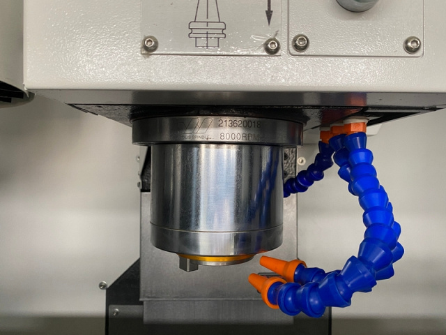 Шпиндель производства компании VOLIS (Тайвань), характеризуется высокой точностью и повышенной жесткостью. Передача крутящего момента происходит за счет ременной передачи. Крутящий момент достигает 35 / 47,8 Нм (постоянный/ пиковый). Для шпинделя предусмотрена бесступенчатая регулировка скорости вращения в его диапазоне скоростей. С помощью встроенного датчика положения шпиндель может выполнять свою ориентацию и функцию жесткого нарезания резьбы.